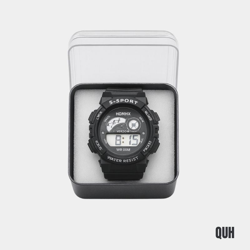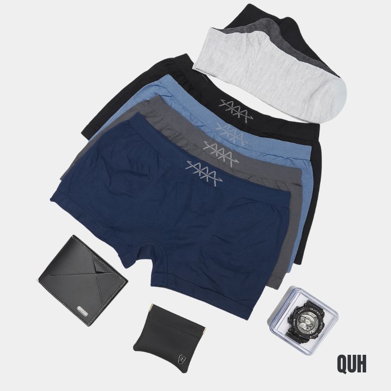 Este combo incluye 12 boxers stretch, 12 medias de algodón, billetera, monedero y reloj deportivo.
